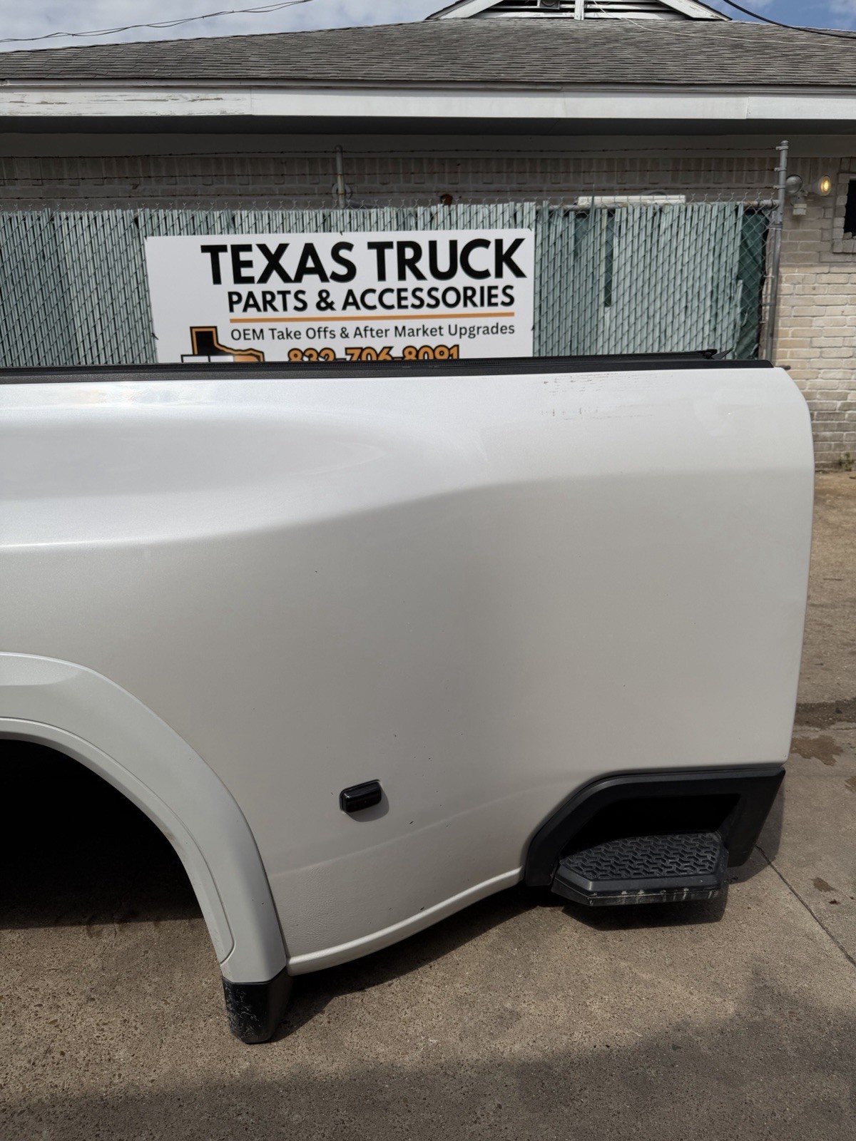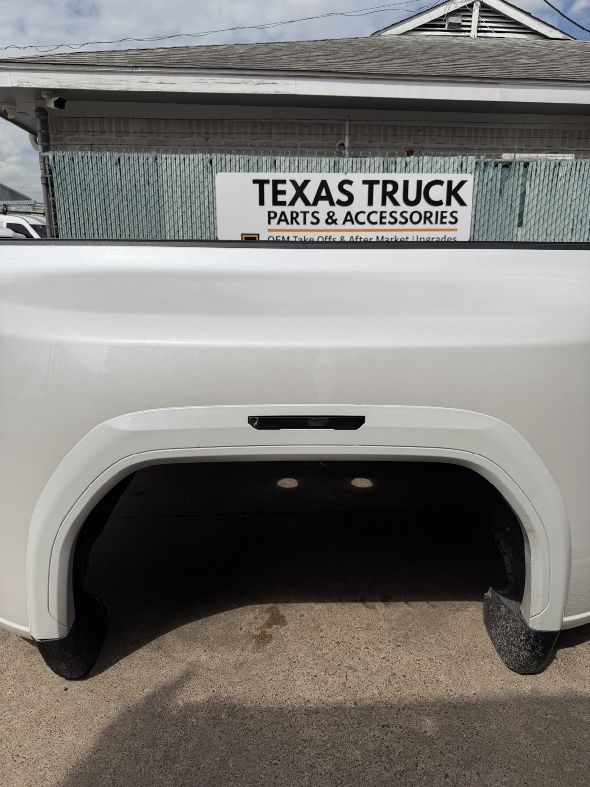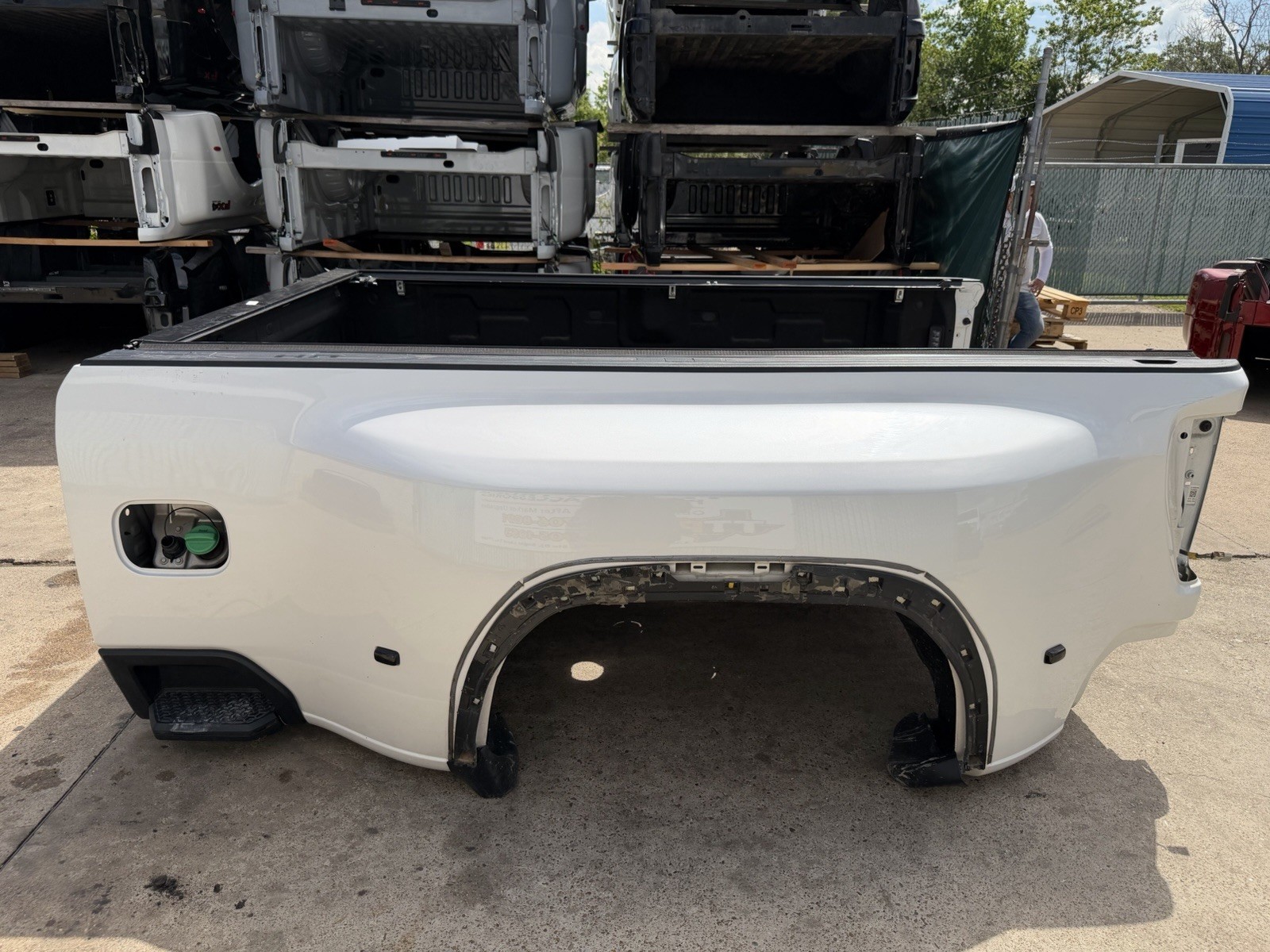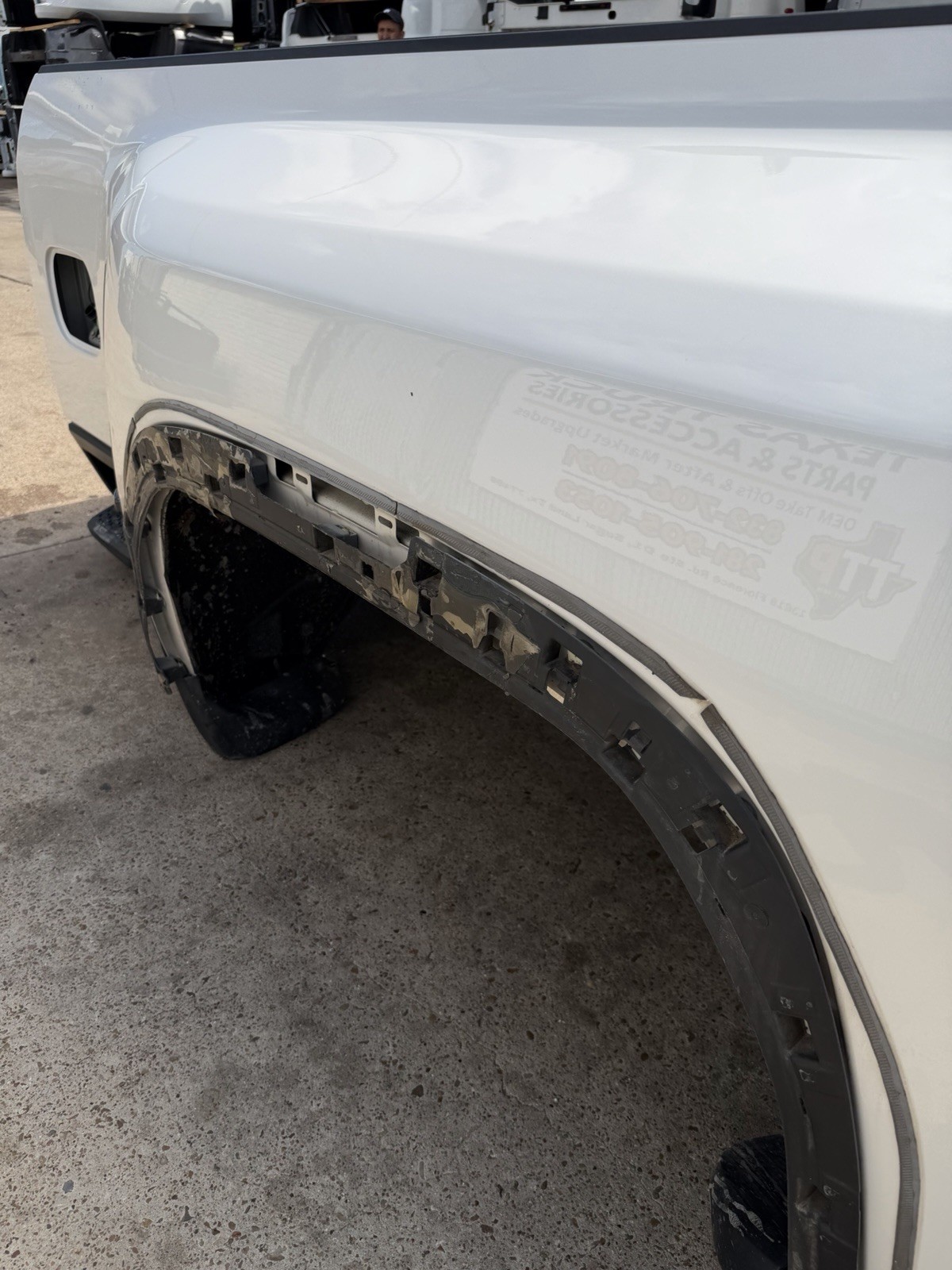 This bed is in good condition, but does have some flaws on it. Came off of a Denali. The plastic trim / flare on the driver side is not there. Gas cap is also missing. This bed has color matched plastic on the right side. Bed has some scuffs / scratches / paint chips. Please do not expect a brand new bed at time of delivery. This bed does not have any dents or noticeable damage to it. The bottom flares that the bed sits on will need to be replaced or bent in to shape.